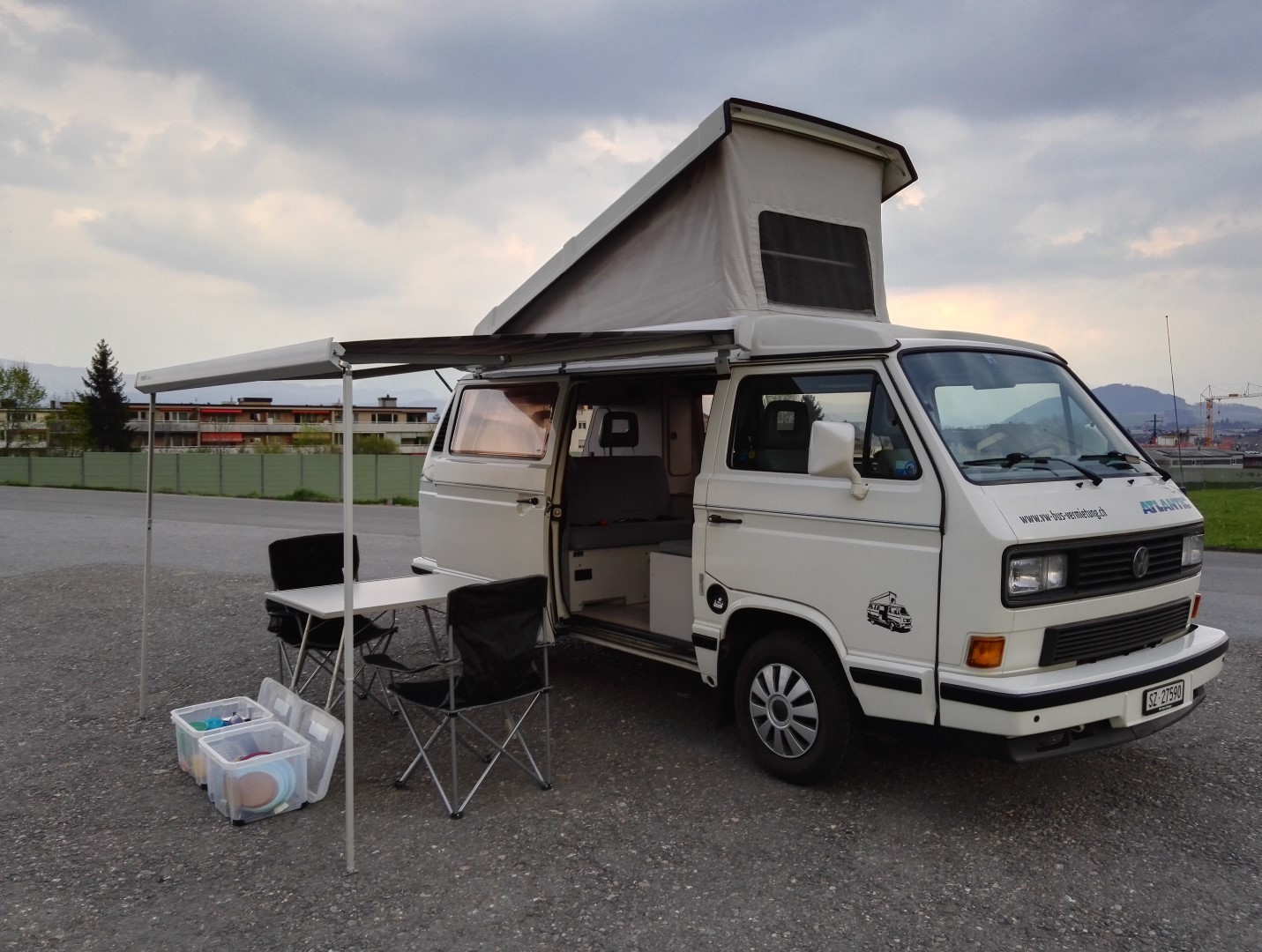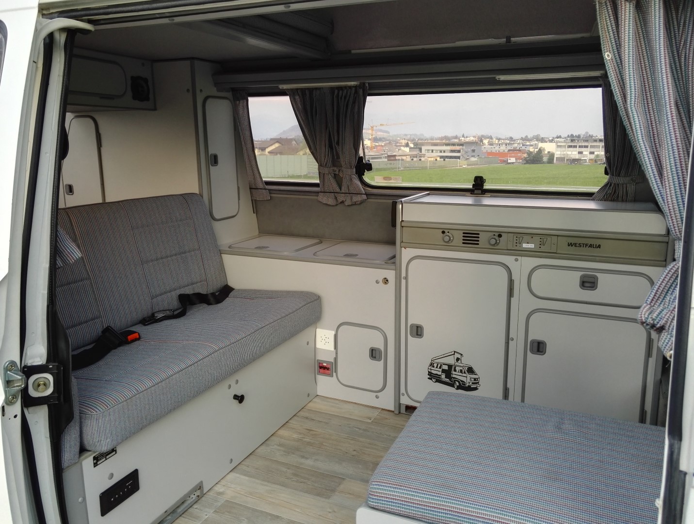 Originaler VW T3 Westfalia Atlantic Camper für 2 – 4 Personen. Mit Unterflur-Gastank und Absorber-Kühlschrank (Gas/12V/220V), sowie Standheizung ist dies der ideale Bus, um auch über längere Zeit autark zu stehen.